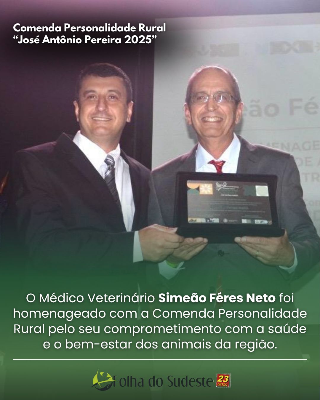 nasceu em 7 de fevereiro de 1958, em Muriaé. Filho de Simeão Féres Filho e Rosa Dilene Fontes Féres, é casado com Tereza Cristina Rodrigues Féres, pai de João Paulo e Luiz Fernando e avô de José e Antônio. Desde cedo demonstrou uma ligação com a terra e com os animais, o que o conduziu à escolha da Medicina Veterinária como profissão. Em 1982, formou-se pela Universidade Federal de Minas Gerais. No início de sua trajetória, dedicou-se a prestar assistência técnica aos associados das cooperativas de Guarani e Muriaé, atuando de forma comprometida com a saúde e o bem-estar dos animais da região. Reconhecido pela disposição constante em contribuir com o melhoramento genético e desenvolvimento da pecuária leiteira, é responsável técnico da loja COOPAF Agropecuária, veterinário responsável por um dos mais importantes projetos de Gado Gir Leiteiro das Fazendas do Basa e palestrante sobre melhoramento genético e saúde animal. Com uma carreira marcada pela ética e pela vocação, segue seu propósito de servir e contribuir para o desenvolvimento rural na região. Simeão agradece o Secretário de Agricultura, Fernando Levati Trota pela a honraria dessa homenagem que recebe com muita satisfação.