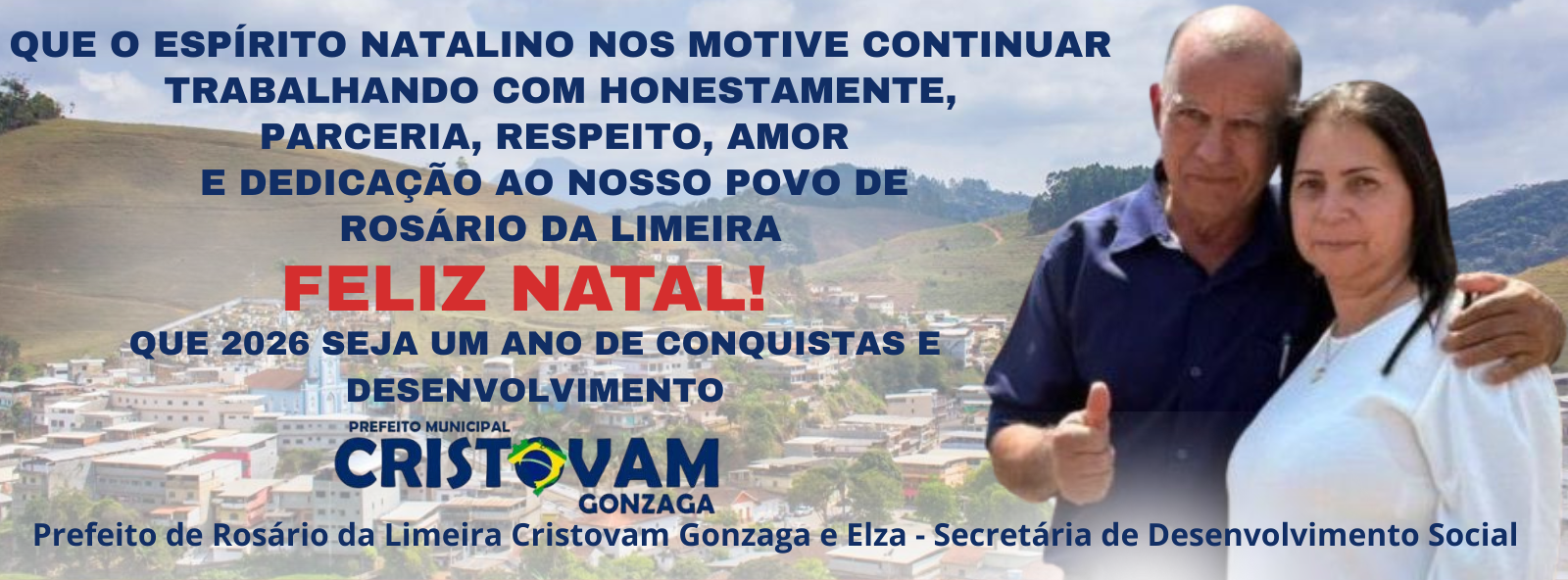 Que o espírito natalino renove nossa fé no trabalho feito com honestidade, respeito, parceria e amor pelo povo de Rosário da Limeira. Seguimos firmes, com dedicação, para que 2026 seja um ano de conquistas, desenvolvimento e mais qualidade de vida para todos. Feliz Natal e um Ano Novo de esperança! Esses são os votos do Prefeito Cristovam Gonzaga