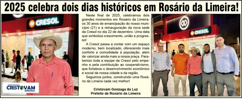 Neste final de 2025, celebramos dois grandes momentos em Rosário da Limeira: os 30 anos de emancipação do nosso município (21) e a reinauguração da nova sede da Cresol no dia 22 de dezembro. Uma data que simboliza crescimento, união e progresso!