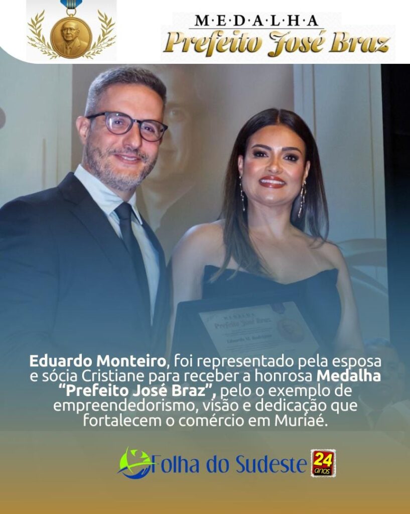 O empresário Eduardo Monteiro Rodrigues foi agraciado com a Medalha Prefeito José Braz 2025, honraria concedida a personalidades que se destacam por incentivar o empreendedorismo, a inovação e o crescimento econômico de Muriaé.